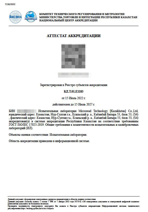 由哈萨克斯坦国家认证中心(NCA)颁发的ISO17025认证证书