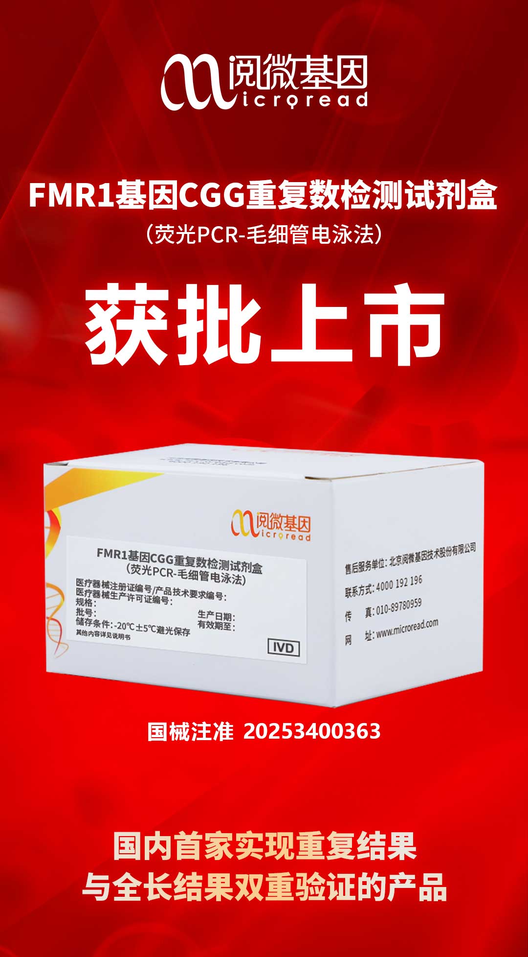 近日,北京阅微基因技术股份有限公司(以下简称“阅微基因”)自主研发的FMR1基因CGG重复数检测试剂盒(荧光PCR-毛细管电泳法)(以下简称“本试剂盒”)获批国家药品监督管理局第三类医疗器械注册证(国械注准20253400363)。