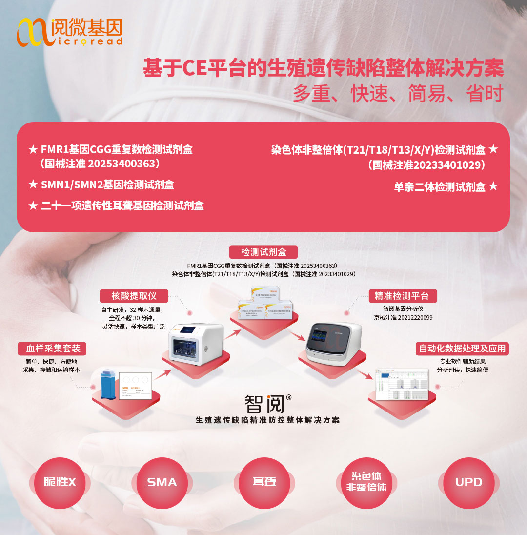 阅微基因基于CE平台布局系列生殖遗传基因检测产品,本试剂盒的获批将进一步推动中国出生缺陷防控事业的发展。未来,阅微基因将持续聚焦CE平台的创新性研发,为遗传疾病的早期诊断和预防贡献力量!