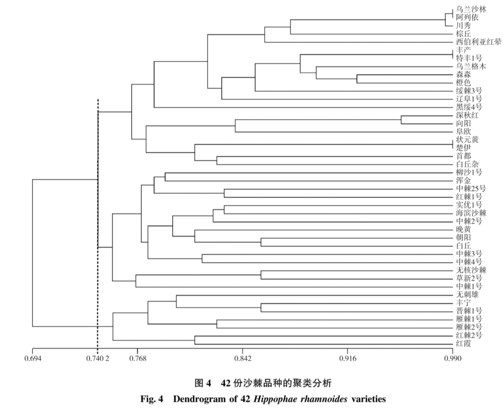 通过UPGMA聚类分析,42份沙棘品种被科学划分为3大组群,清晰揭示品种间遗传相似性。例如,“乌兰格木”与杂交后代“中棘系列”聚为一支,为育种方向提供分子依据。