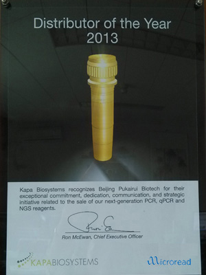 2013年9月9日至11日,KAPA Biosystems 在美国波士顿召开了两年一届的全球经销商大会,会议总结了两年来全球各地经销商的销售业绩,并洽谈了进一步合作事项,同时颁发最佳经销商奖。作为KAPA 在中国大陆区总代理,阅微基因出席了此次会议,并获得了最佳经销商的殊荣。