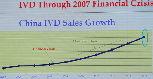 在中国的体外诊断公司中,他以达安基因作为实例,分析了达安基因在2014年的增速情况和销售额占比,其7.25亿的体外诊断收入中,诊断服务占比32%,试剂占43%,仪器占24%。并表示,尽管国际竞争形势非常严峻,但中国体外诊断市场仍在快速发展,预计将在未来的10~15年内超过美国,成为世界上最大的体外诊断市场。