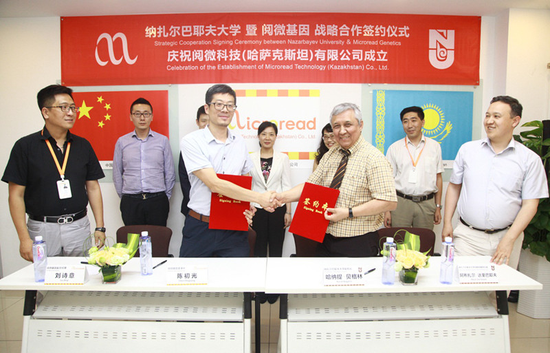 2018年6月7日下午于北京阅微基因总部,哈萨克斯坦共和国纳扎尔巴耶夫大学(以下简称“纳大”)与北京阅微基因技术有限公司(以下简称“阅微基因”)正式签署战略合作协议,纳大由副校长哈纳提·贝格林和创新发展部总监阿布扎尔·达里巴耶夫代表出席,阅微基因则由董事长陈初光和副总经理刘诗意代表出席,中关村科技园区管委会国际交流合作处的蒋崇华处长等领导现场见证了签约仪式。