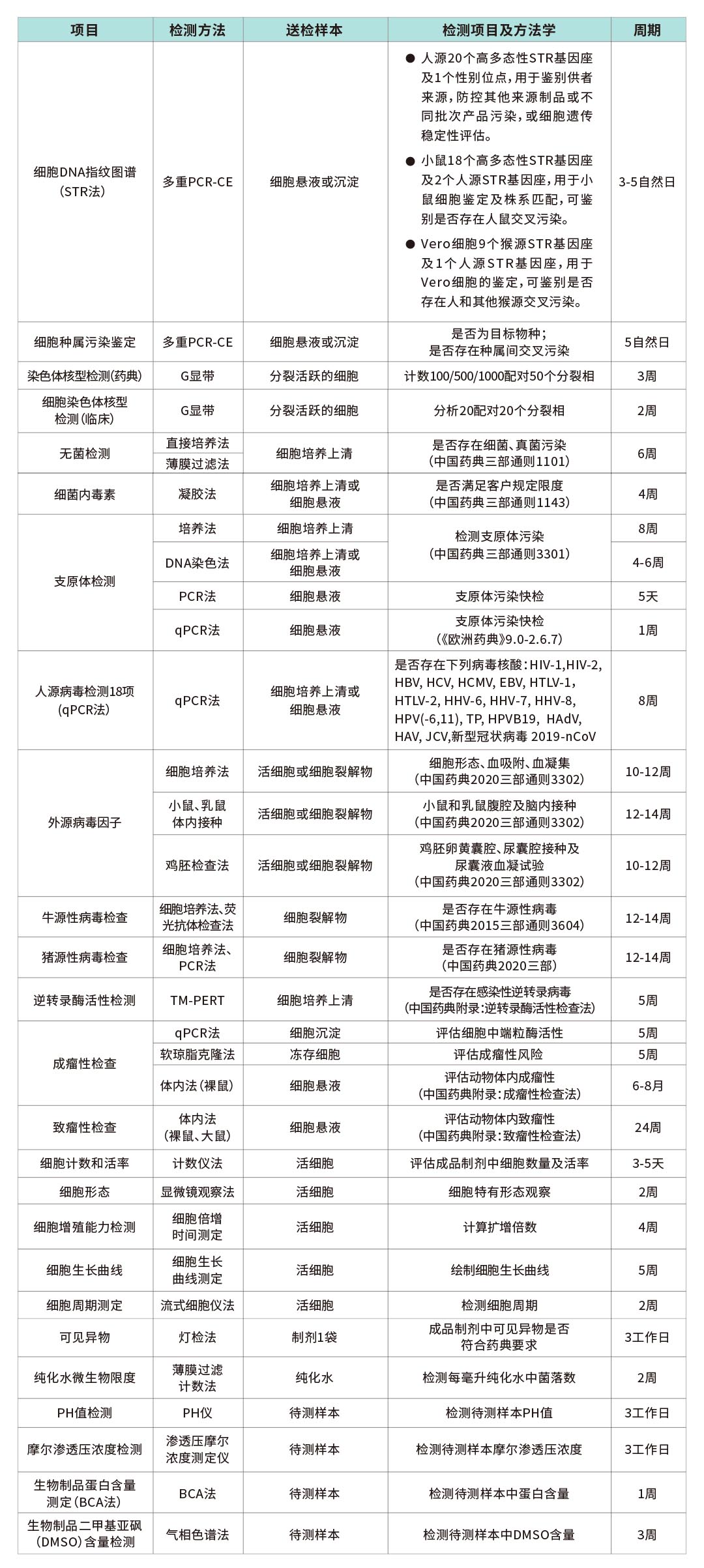 细胞被用作为生产、检定或治疗的工具。除细胞鉴别用于识别为本细胞且无其他细胞交叉污染外,对细胞在纯化、培养或传代过程中可能发生的变化及受到微生物侵染的风险也需严格控制。安全性与污染检查包含无菌、支原体、内/外源病毒因子、染色体检查、成瘤/致瘤性检查等项目。《中国药典》明确对生产用细胞、连续传代细胞系、人二倍体细胞、重组细胞、原代细胞及检定用细胞规定了应检项。