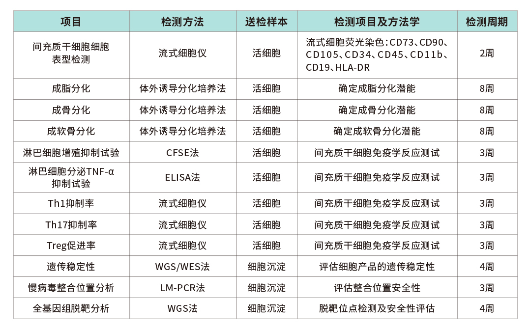 细胞用作治疗性产品时,除基本细胞库检测项目外尚需考虑其他风险。因此,对于治疗性细胞产品检定要求还应考虑细胞特性及其他安全性等指标,包含细胞形态、免疫学特性、增殖分化能力、表型标记物鉴别、分化潜能、遗传稳定性等。