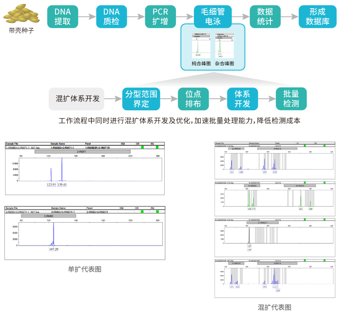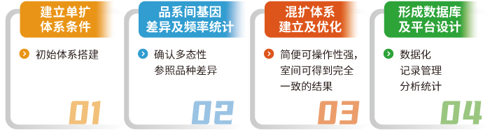 需求确认 >> 确定位点方案 >> 分型判读定义(和已知品种对比) >> 构建混扩体系 >> 优化组合 >> 批量检测
