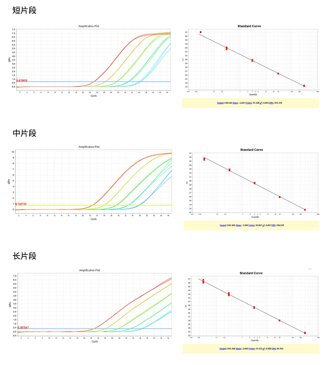 本试剂盒采用qPCR荧光探针法原理,设计了三种不同的扩增片段(88 bp、209 bp、368 bp),用试剂盒配套的CHO DNA定量标准品分别对不同的扩增片段制作标准曲线,以此来 定量检测分析样品中CHO细胞宿主残留DNA片段分布情况。本试剂盒检测快速,专一性强, 性能可靠,最低检测限可以达到fg水平。