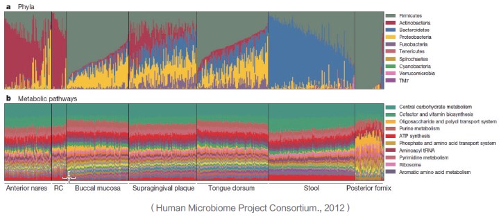 基于元基因组shotgun测序和16S 序列分析数据,门水平的物种分类展示了健康人体7个不同部位的微生物组成特征,并预测微生物组的代谢途径,表明一些代谢途径在不同的个体及身体部位普遍存在。