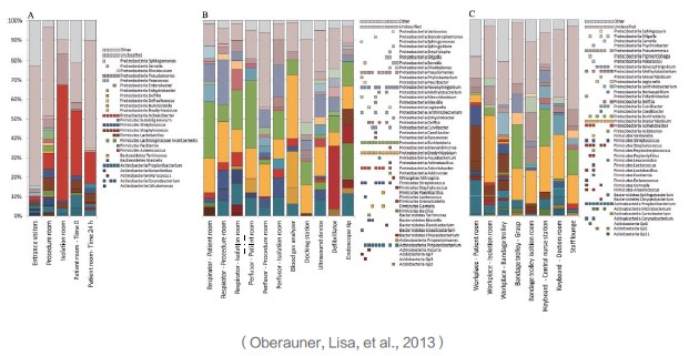 采用SnoWMAn软件对16S序列相似性进行分析,比较地面环境(A)、医疗用具(B)和工作环境(C)的细菌组成差异。