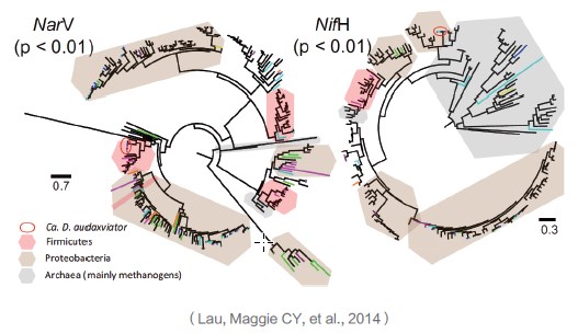采用NarV基因和NifH基因的氨基酸序列构建最大似然系统发育树,计算氨基酸位点替代速率,揭示氮循环相关的功能基因在元基因组中的进化关系。