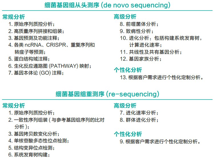 微生物基因组测序根据客户需求可获得框架图、精细图和完成图。其中完成图采用第三代单分子测序(PacBio)和第二代高通量测序结果进行拼接和组装;精细图根据第二代高通量测序的结果进行拼接和组装。重测序结果可进行功能基因分析(如耐药基因分析)、进化分析、毒力分析等,为后续的功能研究提供理论基础。
