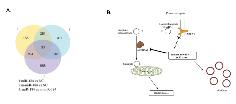 B.全转录组层面分析得出,m-miR-184可以影响丙氨酸、天冬氨酸和谷氨酸代谢通路通过对ALDH5A1 和 GABRA3进行负调控,进而导致眼部疾病,同时circRNA可以充当m-miR-184分子海绵。