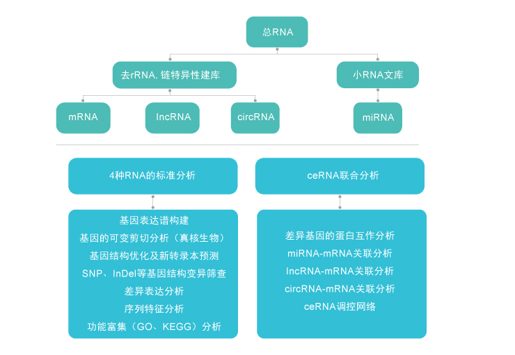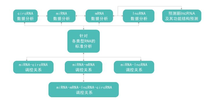 针对mRNA、lncRNA、circRNA和miRNA的标准分析和高级分析,还包括不同种RNA之间的互作网络调控分析。