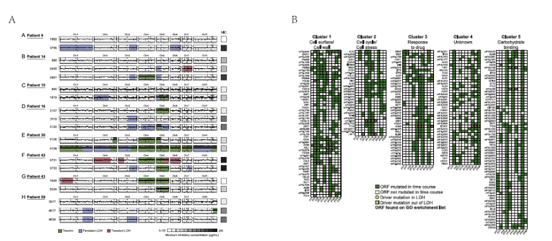A. 永久的和暂时的杂合性缺失图谱,左边代表不同的病人,蓝色代表永久杂合性缺失,红色代表暂时杂合性缺失,绿色代表三倍体型,右边方框代表每个菌株对应的药物最小抑菌浓度(越深色浓度越高)。